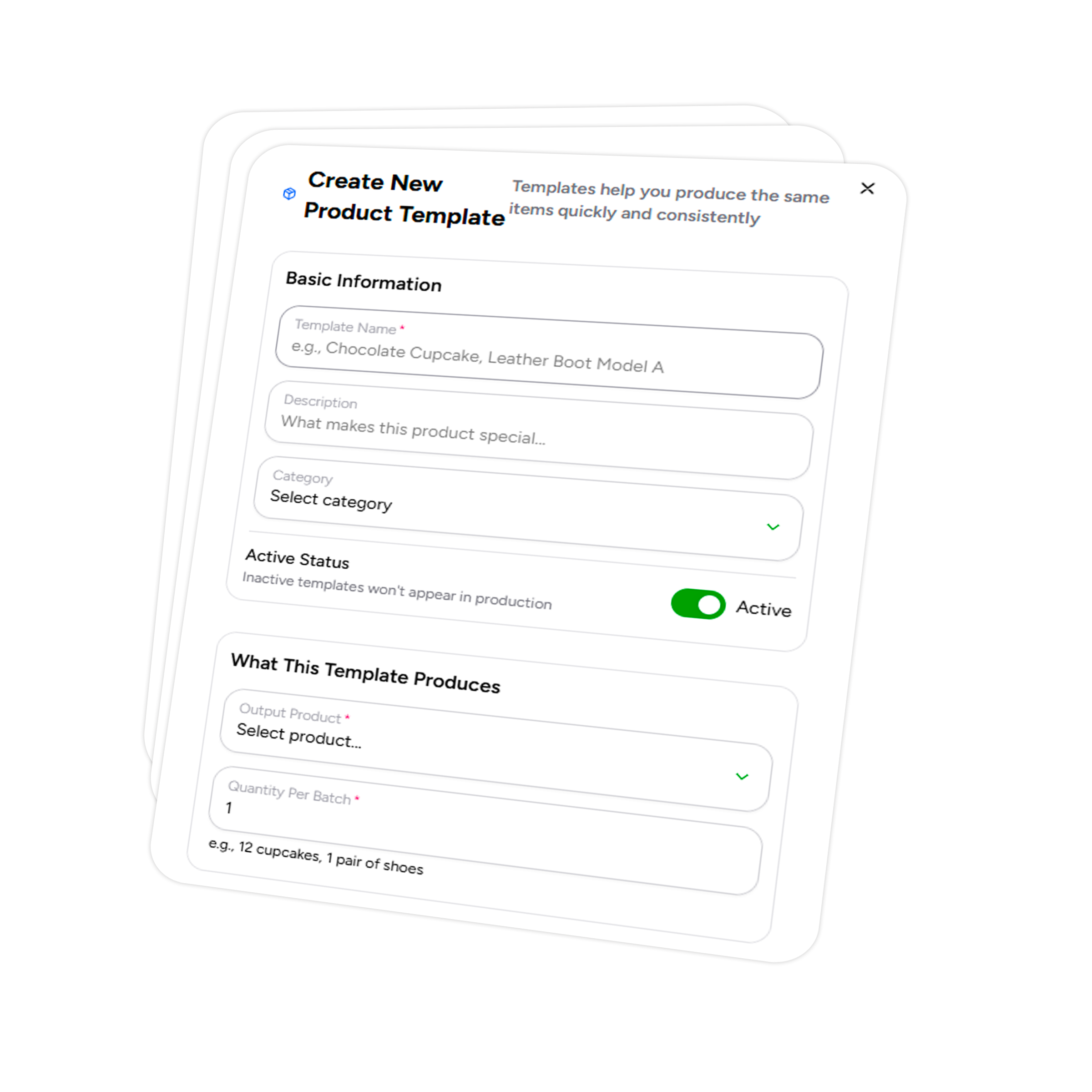 Manage manufacturing batches, define recipes, and calculate unit costs for your products.